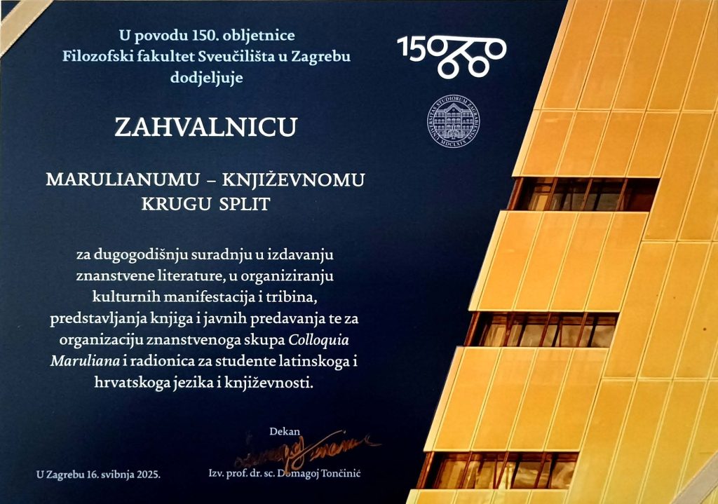 Povodom 150. obljetnice Filozofskog fakulteta Sveučilišta u Zagrebu, Fakultet je 16. svibnja 2025. Književnome krugu Split – Marulianumu dodijelio zahvalnicu za dugogodišnju suradnju u izdavanju znanstvene literature, u organiziranju kulturnih manifestacija i tribina, predstavljanja knjiga i javnih predavanja te za organizaciju znanstvenog skupa Colloquia Maruliana i radionica za studente latinskoga i hrvatskoga jezika i književnosti. U ime Književnoga kruga Split zahvalnicu je primio Neven Jovanović, član KKS i urednik Colloquia Maruliana.